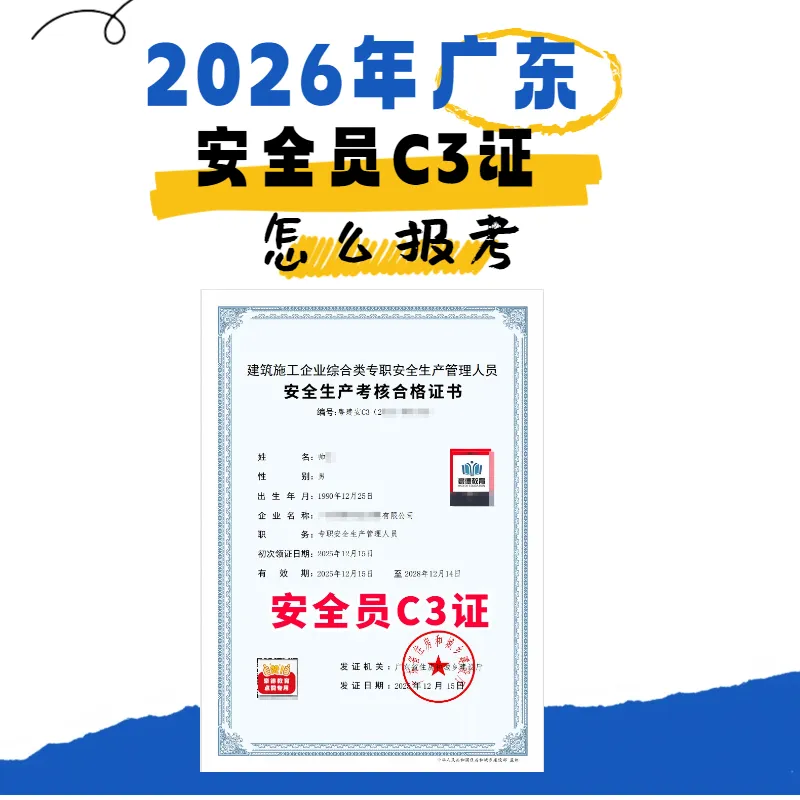 其中,广东安全员C证是直接考C3证,又称粤建安C3证,C1+C2,即土建+机械综合;