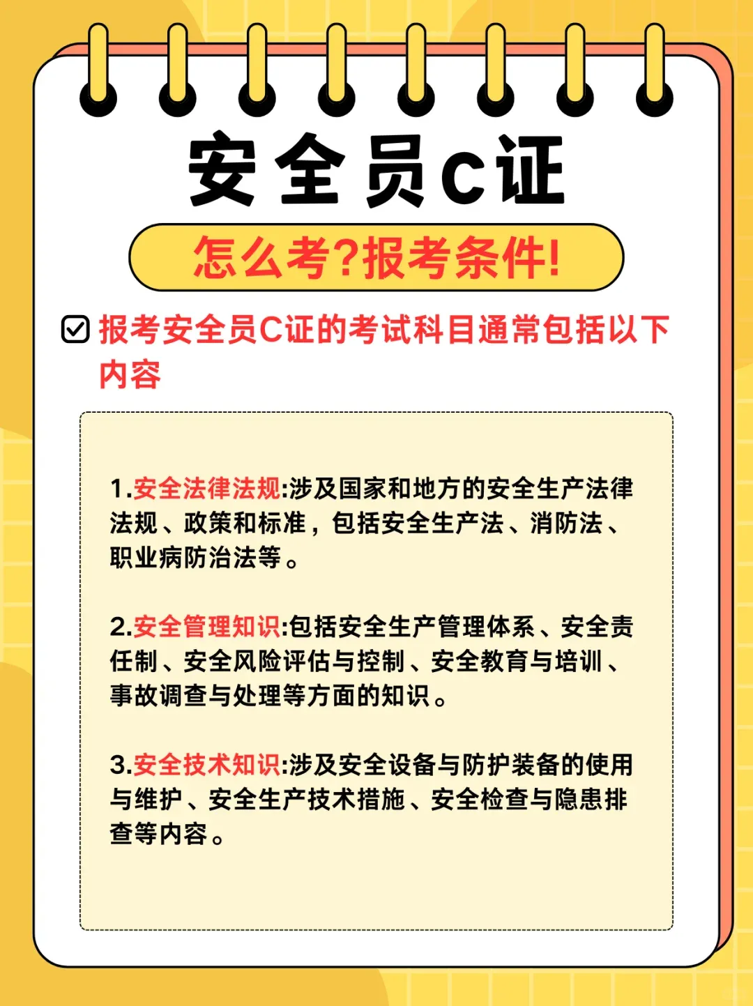 安全员 C 证的考试以 “理论 + 实用” 为核心,不同类别考试内容略有差异,整体难度适中,认真备考就能通过: