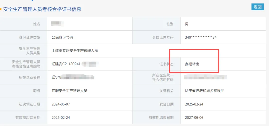 最近有个学员小李(化名)遇到了一件糟心事 —— 他的建筑安全员 C2 证从辽宁办理跨省调出时一切顺利,在「全国工程质量安全监管信息平台」上也明确显示 “办理转出” 状态,本以为能顺利转入天津的现任职单位,结果却被天津住建厅无情驳回!