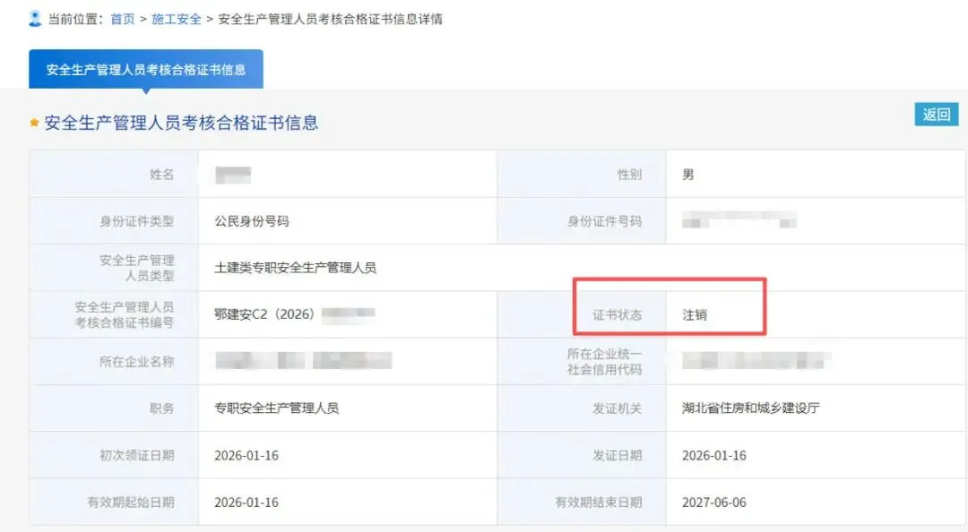 ❶安全员 C 证跨省调出后,调入目标城市被驳回;