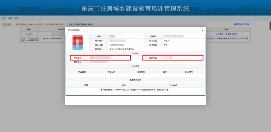 登录重庆市住房城乡建设教育培训管理系统:http://jsgl.zfcxjw.cq.gov.cn:8005/cqjsgwjypx/outter/search/certificate