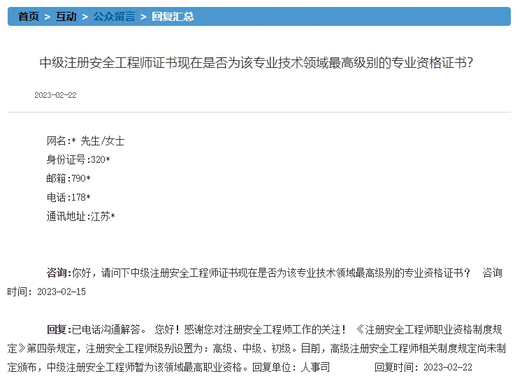 人事司给出明确答复:目前,高级注册安全工程师相关制度规定尚未制定颁布,中级注册安全工程师暂为该领域最高职业资格。