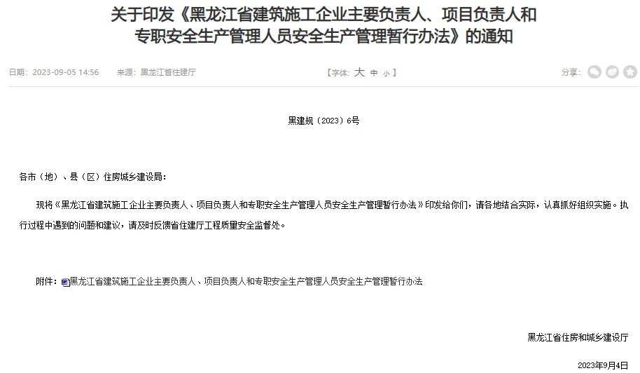 但是23年9月黑龙江省住建厅发布《黑龙江省建筑施工企业主要负责人、项目负责人和专职安全生产管理人员安全生产管理暂行办法》。
