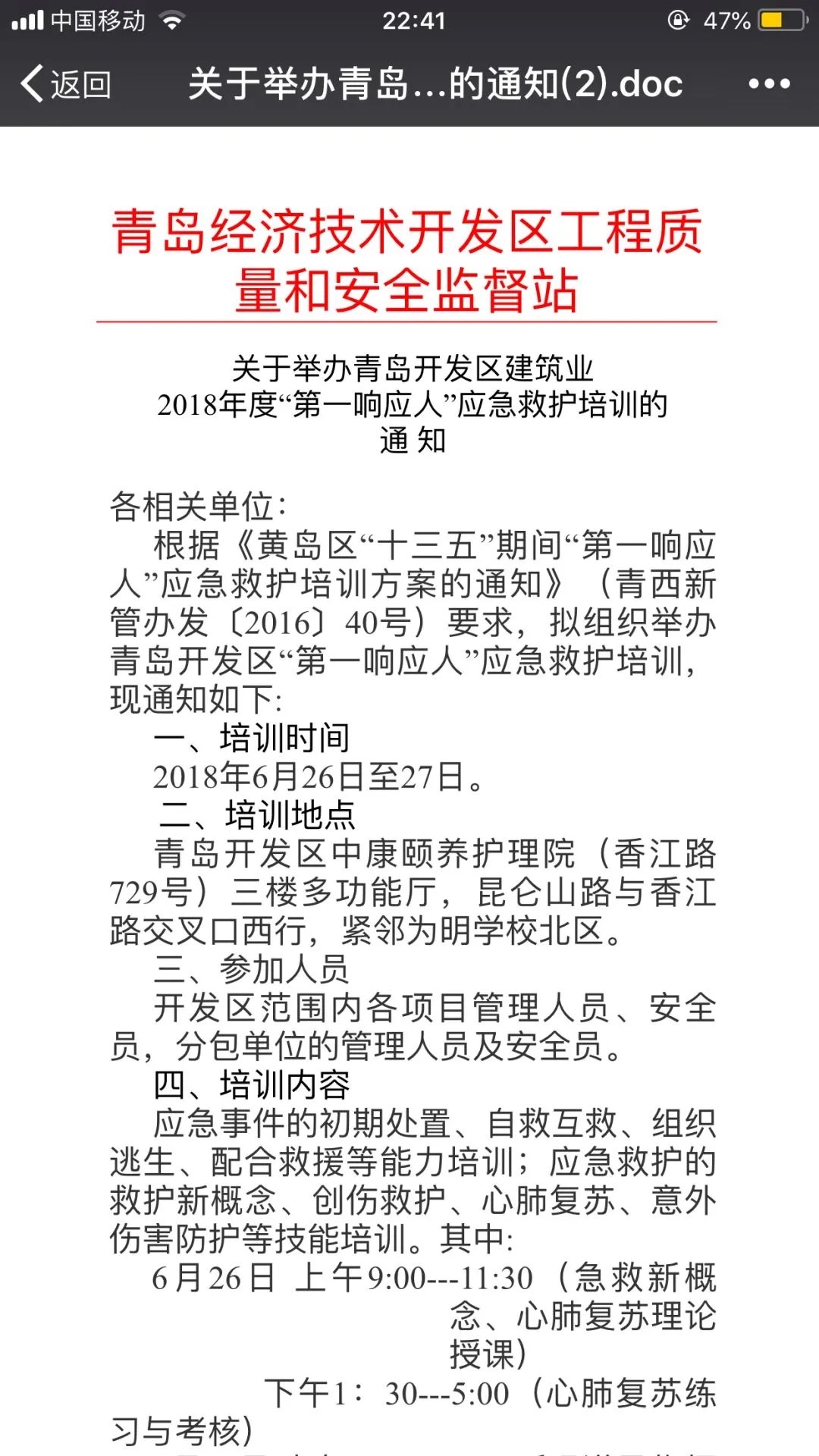 建筑行业是一个高危行业,意外伤害的发生率高于普通行业,做好建筑行业的应急救护培训,提高从业人员防灾避险和救护能力非常必要,意义重大。6月26日、27日,区红十字会对123名青岛开发区建筑业的安全员开展了“第一响应人”应急救护培训,为他们戴上了“生命安全帽”。