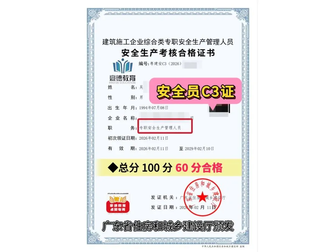 广东省安全员C证,也称建筑施工企业三类人员C证、三类人员C证。