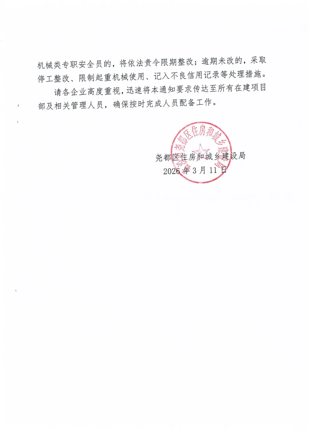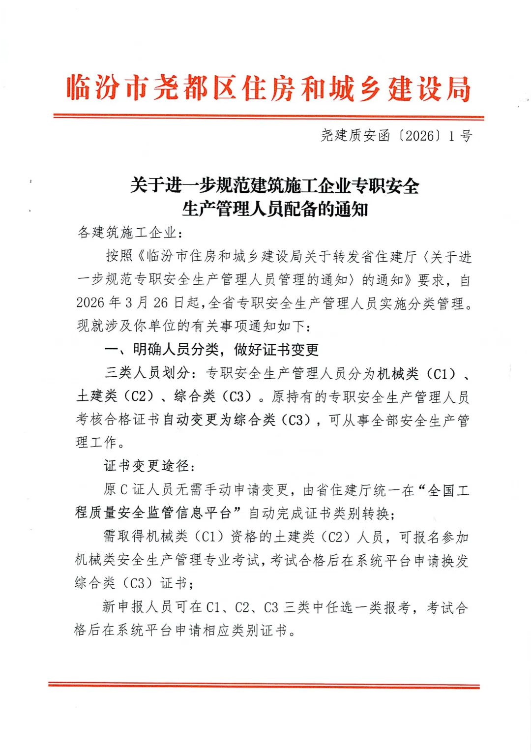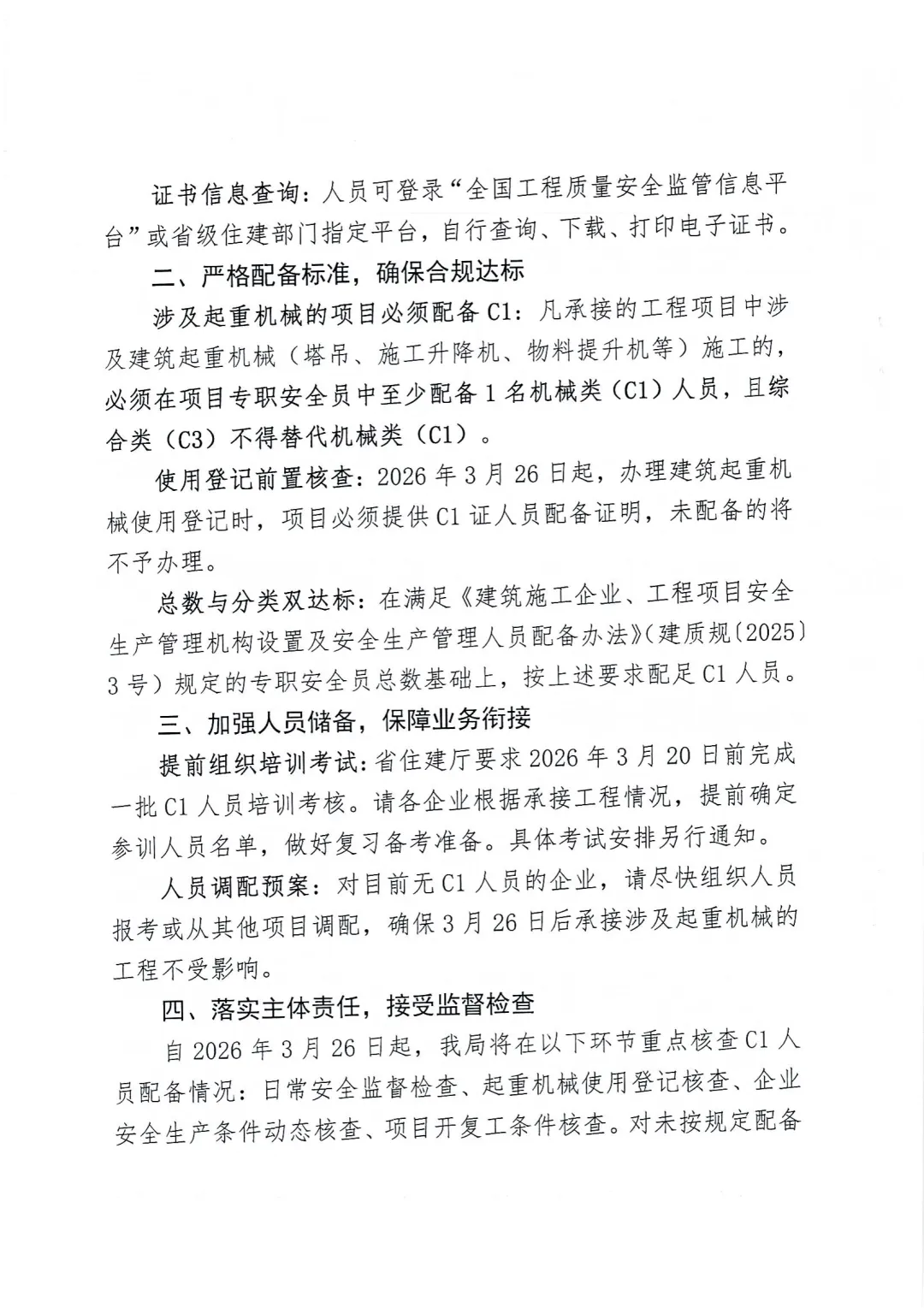 根据省住建厅《关于进一步规范专职安全生产管理人员管理的通知》要求,自2026年3月26日起,涉及起重机械(塔吊、施工升降机等)的项目,必须至少配备1名机械类(C1)专职安全员,综合类(C3)不得替代C1。