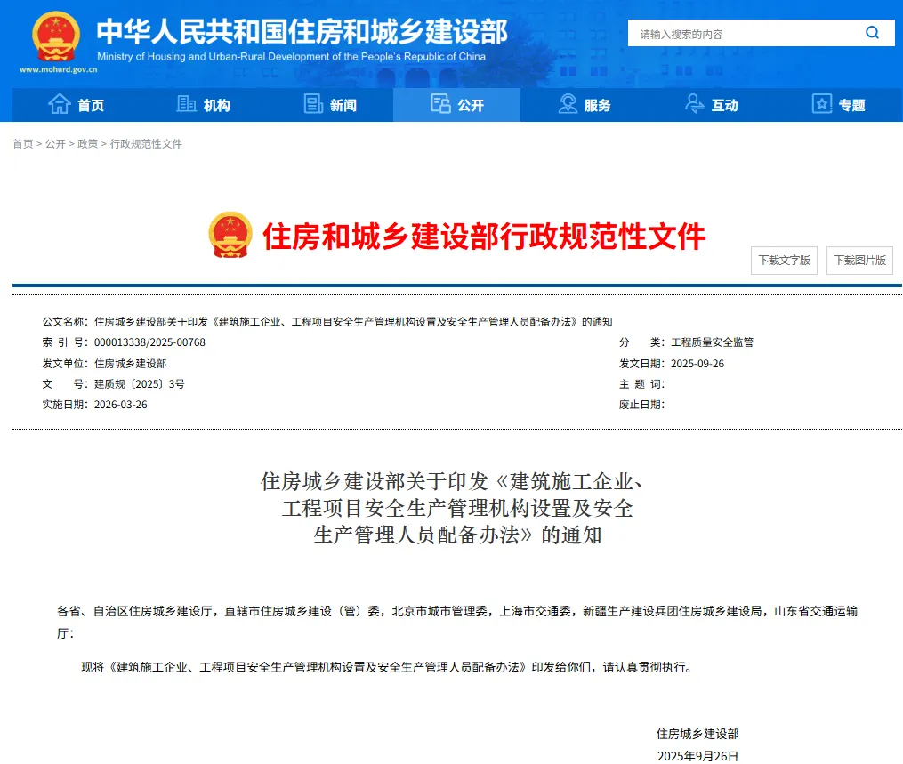2025年9月26日,住房城乡建设部正式印发《建筑施工企业、工程项目安全生产管理机构设置及安全生产管理人员配备办法》,要求全国建筑企业严格贯彻执行,这意味着行业安全生产管理从“建议项”彻底转向“硬指标”,2026年3月26日将全面落地。现在全国多省已火力全开落实,北京虽暂未发文件,但“核查信号”已到!