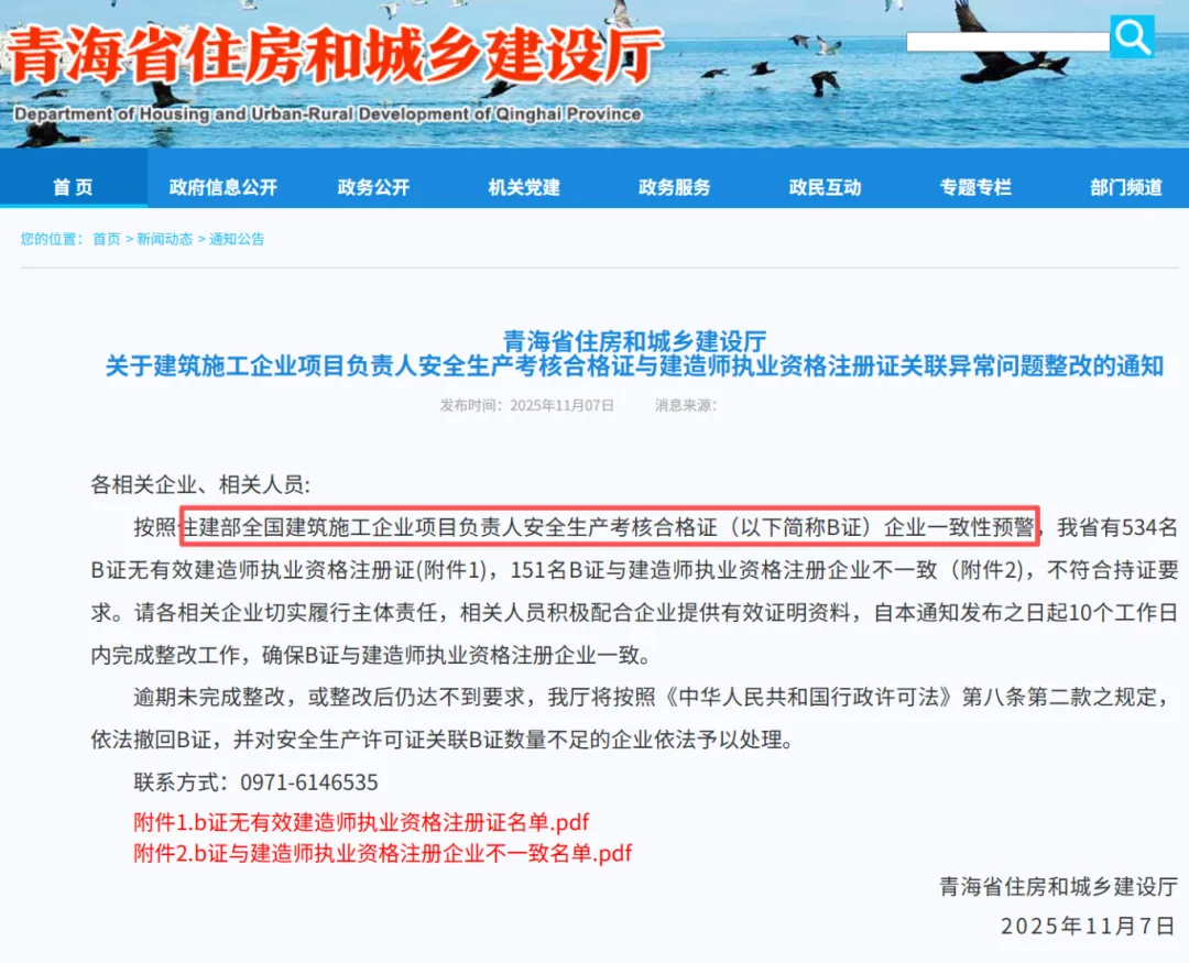 青海:534人B证无建造师注册证、151人证书与企业不一致,10个工作日内必须整改,逾期直接撤回B证、安许证关联不足的企业依法处理。