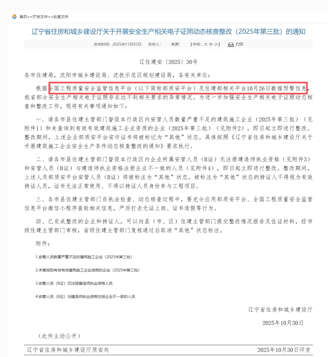 辽宁:安管人员数量不足、B证与建造师信息不符的企业/人员,证书直接标为“其他”状态,不能用证、不能参与项目。