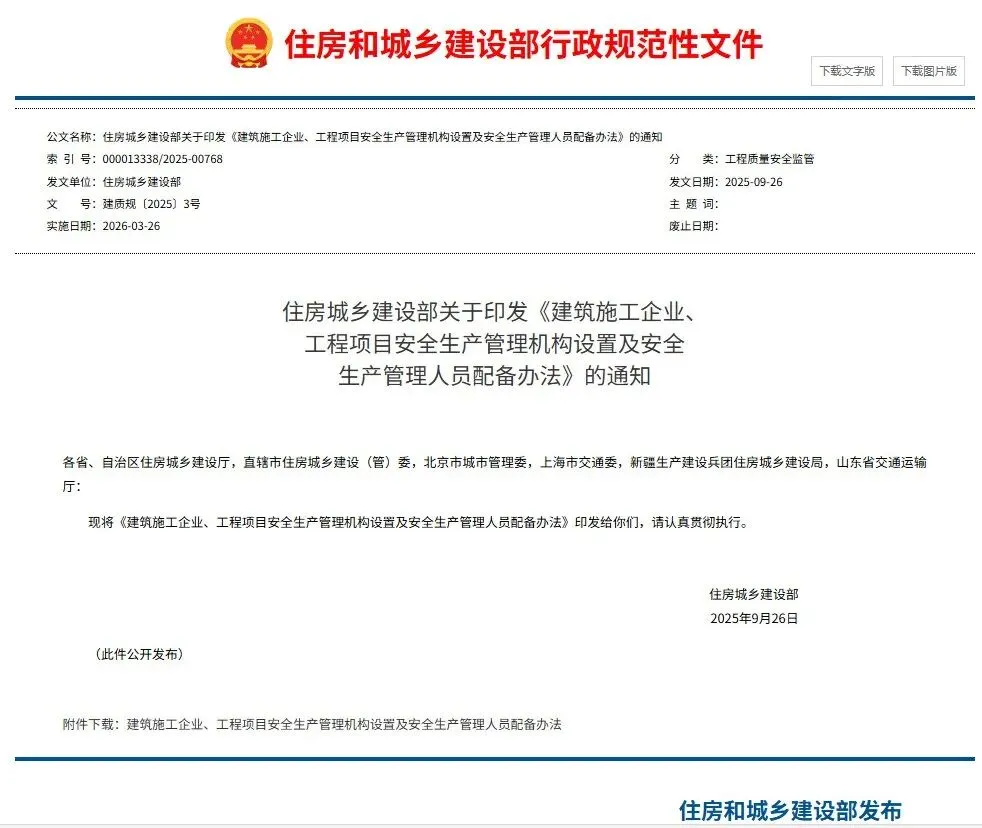 新规细化企业 + 项目安全员配备底线,未达标不予核发施工许可证,已开工责令停工整改: