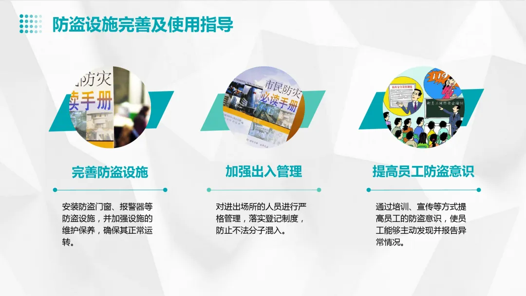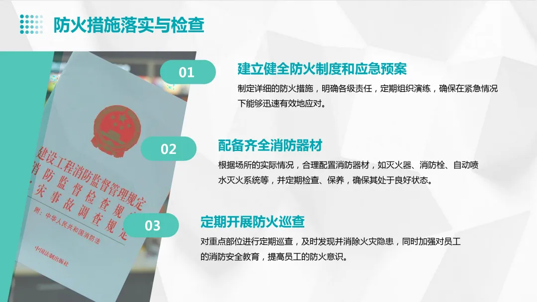 【解析】定期检查电气线路、禁止吸烟、使用合格的消防器材和设置消防通道都属于防火安全措施。